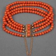 Vierstrengs bloedkoralen armband, aan 14kt gouden bakslot gezet met vier bloedkoraaltjes en veiligheidsketting, lengte circa 18 cm