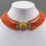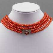 Vijfstrengs bloedkoralen collier aan 14kt gouden slot, gedecoreerd met cantille, 19e eeuw, brutogewicht 99,2 gram, lengte circa 36 cm