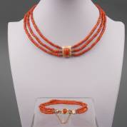 Driestrengs bloedkoralen kralencollier aan 14kt gouden bakslot met cabochongeslepen bloedkoraal en driestrengs bloedkoralen armband aan 14kt gouden bakslot met veiligheidsketting, collier circa 40 cm, armband circa 18 cm -armband met onedele verbindingsogen-