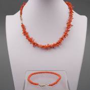 Bloedkoralen stokjescollier aan 18kt gouden karabijnsluiting, en bloedkoralen enkelbandje aan14kt gouden sluiting met drie zaadpareltjes, collier 46 cm, enkelbandje 22 cm