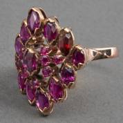 BWGG navette-ring gezet met 14 navettegeslepen robijnen en tien achtkantgeslepen robijntjes, mt.18, brutogewicht 5,0 gram