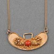 14kt gouden collier waaraan een deel van een sluiting gedecoreerd met filigrain en gezet met bloedkoraaltje, brutogewicht 5,2 gram, lengte nu 43 cm -twee knoopjes nabij slot-