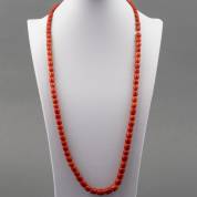En chûte geregen bloedkoralen kralen collier van tonkralen, aan verenigde 14kt gouden lakbollen, lengte circa 86 cm, grootste kraal 1,2 cm, kleinste kraal 0,5 cm