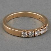 14kt gouden rijring gezet met vijf briljantgeslepen diamanten, totaal circa 0.25ct, kleur H, kwaliteit SI, mt.16, brutogewicht 2,6 gram