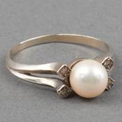 14kt witgouden ring gezet met parel omringd door vier achtkantgeslepen diamantjes, mt. 19,25, brutogewicht 3,0 gram