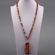 Kornalijnen kralencollier met kwast van zonnesteenkralen gehouden in 14kt gouden montuur volledig pavégezet met roos en schijfdiamantjes, lengte collier 70cm, lengte kwast circa 10 cm
