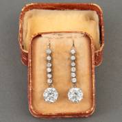 Paar BWGG en zilveren oorhangers, elk gezet met zes kleine en één grote simuli, 19e eeuw, brutogewicht 5,0 gram, lengte circa 3 cm, in doosje met los deksel