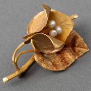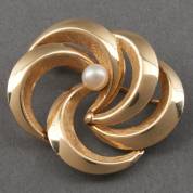 14kt gouden broche met deels gematteerde boogjes en gezet met gecultiveerde parel, brutogewicht 6,0 gram, circa 3,5 × 3 cm