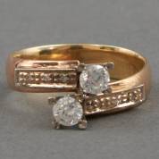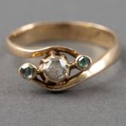 14kt gouden slagring gezet met drie roosdiamanten, de centrale steen wit, de twee kleinere groen getint, mt. 19,75, brutogewicht 3,8 gram
