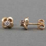 Paar 14kt gouden solitairoorstekers, elk gezet met briljantgeslepen diamant 0.10ct in bloemvormige zetting, brutogewicht 1,4 gram, circa Ø 0,6 cm