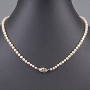 En chûte geknoopt parelcollier van gecultiveerde parels aan 14kt wit- en gouden parelslot, lengte circa 50 cm -drie parels op slot ontbreken-