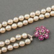 Dubbelstrengs parelcollier van gecultiveerde parels aan 18kt witgouden bloemslot gezet met robijntjes en diamant, lengte circa 58 cm