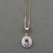 BWGG witgouden gourmet schakelcollier waaraan een BWGG hanger gezet met een entourage van ovaal gefacetteerde tanzaniet en twaalf achtkantgeslepen diamantjes, brutogewicht 3,10 gram, lengte circa 45 cm