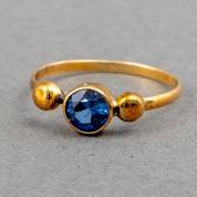 14kt gouden ring met saffier in kastzetting, geflankeerd door gouden bolletjes, mt. 15,5, gewicht 0,8 gram