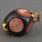 Hanger van kemirinoot ingelegd met agaten cirkels en gehouden in BWGG montuur, brutogewicht 7,4 gram, lengte circa 4 cm