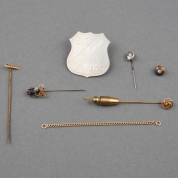 Diverse speldjes, waaronder twee 14kt gouden, 14kt gouden verlengketting van 7cm, en speld met vlieg, en 2e gehalte zilveren schildbroche HBS, brutogewicht 10,4 gram, schildje circa 2,5 × 2,5 cm