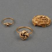Diverse gouden sieraden: broche -defect-, knoopring, mt. 18 en kinderring gezet met granaatje, mt. 14, brutogewicht 7,3 gram
