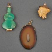 Drie steen- en benen hangers met BWGG montuur en hangoog; jade in gitaarvorm, agaten plak en benen hoofd, plak 5 × 3 cm