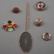 Zes zilveren broches, diverse gehaltes, alle gezet met natuursteen, waaronder agaat, chalcedoon en heliotroop, daarbij een 2e gehalte zilveren collier waaraan een grote agaten hanger, brutogewicht 59,2 gram, agaten hanger 7 × 4 cm
