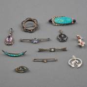 Diverse zilveren broches en hangers, veelal gezet, waarvan één gezet met opaaltriplet en onyx, brutogewicht 43,2 gram, ovale broche circa 5 × 1,7 cm