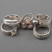Vijf 1e gehalte zilveren ringen, alle gemerkt Ti Sento, gezet met zirkonia, parel en maansteen, mt 20-21, brutogewicht 56,4 gram