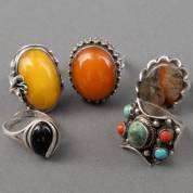 Vijf zilveren ringen, diverse gehaltes, alle gezet met natuursteen, circa mt 20, brutogewicht 60,0 gram