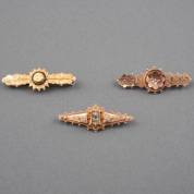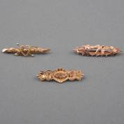 Drie BWGG Victoriaanse broches, één gezet met simuli voor smaragd en diamant, brutogewicht 9,6 gram, lengte circa 4,5 cm