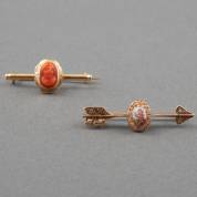 Twee 14kt gouden spelden, één gezet met camee van bloedkoraal, de ander geëmailleerd en gezet met zaadpareltjes, brutogewicht 3,4 gram, lengte circa 3,5 en 3 cm