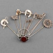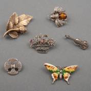 Zes zilveren broches, diverse gehaltes, waaronder: één verguld in de vorm van een rozentakje, gemerkt: Flora Danica, Eggert, Denmark, insect gezet met tijgeroog en zaadpareltjes, brutogewicht 42,4 gram