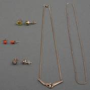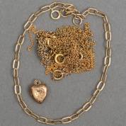 BWGG anker schakelarmband, gemerkt 9kt, gewicht 3,2 gram, lengte circa 21,5 cm, BWGG hartvormige bedel -gedeukt-, en diverse colliers, waaronder BWGG en verguld -defecten-