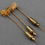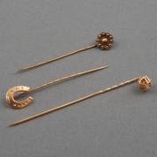 Drie 14kt gouden spelden; hoefijzer, Zeeuws knoopje, en diamantschijfje in chatonzetting, brutogewicht 3,0 gram, lengte circa 5 cm