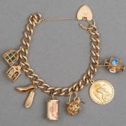 BWGG gourmet schakelarmband, gemerkt 9kt, aan hartvormig slot, en voorzien van acht diverse BWGG bedels, alle gemerkt, brutogewicht 62,4 gram, lengte circa 18 cm