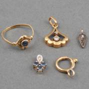 14kt gouden hanger gezet met diamantje, 14kt gouden kinderringetje, mt 13,5, 14kt witgouden hangertje gezet met drie blauwe saffiertjes, gouden slotje en pampeltje, brutogewicht 2,7 gram