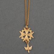 14kt gouden gourmet schakelcollier waaraan een hanger met Hugenotenkruis, gewicht 4,2 gram, lengte circa 50 cm
