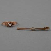 14kt roségouden solitairring gezet met roosdiamant in chatonzetting, mt 17,75, en 14kt gouden speld met diamantje, brutogewicht 3,2 gram -speld sluit niet goed-