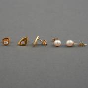 Paar 14kt gouden oorstekers met briljantgeslepen simuli, daarbij enkele 18kt gouden oorsteker met simuli en paar 14kt gouden oorstekers met gecultiveerd pareltje, brutogewicht 3,6 gram, parel circa 6 mm