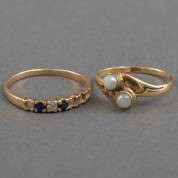 Twee 14kt gouden ringen, één slagring met twee pareltjes, mt. 16,75, en een rijring gezet met simuli voor saffier en diamant, mt. 17, brutogewicht 2,0 gram -pareltjes gesleten en rijring mist drie steentjes-