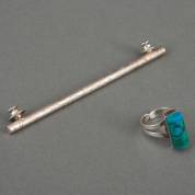 1e gehalte zilveren staafvormige broche, met geciseleerde motieven, met twee onedele schroeven, daarbij zilveren verstelbare ring met staafvormige chrisocolla, brutogewicht 16,1 gram, staaf circa 11 cm