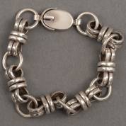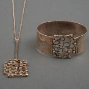 Set van 1e gehalte zilveren armband en hanger aan jasseron schakelcollier, meester: Menno Meijer, gewicht 59,0 gram, lengte collier 60 cm, hanger 8 cm, binnenmaat armband 6 ×5 cm