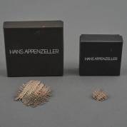 Twee 2e gehalte zilveren geweven broches, meester: Hans Appenzeller, circa 1980, in doosje, gewicht 14,8 gram, groot circa 5 × 5 cm, klein circa 2 × 2 cm, elk in origineel doosje