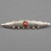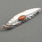 Gehamerde zilveren broche gezet met cabochongeslepen bloedkoraal, art deco , onduidelijk gemerkt, brutogewicht 5,0 gram, circa 7 × 1,8 cm