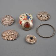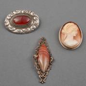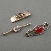 Drie zilveren broches, één gehamerd en gezet met rookkwarts, meester: R. Jephcott, één 2e gehalte zilver gezet met maansteen, één 2e gehalte knoopbroche gezet met carneool, brutogewicht 16,6 gram