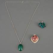 1e gehalte zilveren hanger met cabochongeslepen agaat, 1e gehalte zilveren hanger met ruwe dioptaas en zilveren jasseron schakelcollier met ovale malachiethanger, brutogewicht 70,1 gram, lengte collier circa 70 cm