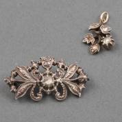 Gouden en zilveren bloemvormige hanger gezet met roosdiamant in dichte zetting en 2e gehalte zilveren broche gezet met roosdiamant, brutogewicht 10,1 gram, 3,5 ×1,7 cm