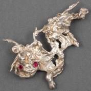 1e gehalte zilveren hanger van dier in ruwe zilvervorm, de ogen gevormd door twee synthetische robijntjes, brutogewicht 26,8 gram, circa 6 × 7 cm
