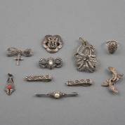 Diverse zilveren sieraden, diverse gehaltes, veelal gezet met markasiet, ring mt. 17,75, brutogewicht 47,4 gram, grootste hanger circa 6 × 3 cm -defecten en onedele delen-