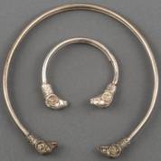 Set van 3e gehalte zilveren spangcollier en -armband, beide met twee ramskoppen, gewicht 83,3 gram, binnenmaat collier circa Ø 12 cm, binnenmaat armband circa Ø 5,5 cm