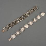 Twee 3e gehalte zilveren schakelarmbanden, één met filigrain bloemdecor, de ander met opengewerkte schakel met twee bloemen, gewicht 47,8 gram, lengte 18,5 en 19,5 cm -één sluiting defect-