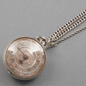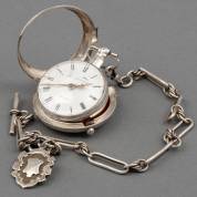 1e gehalte zilveren herenvestzakhorloge, D. Neveren, witgeëmailleerde wijzerplaat, in gladde beschermkast, meester: Robert Pringle, Londen, aan horlogeketting met schildvormige fob-hanger, brutogewicht 65,4 gram, diameter beschermkast Ø 6 cm, lengte horlogeketting 38 cm