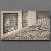 Rechthoekige 1e gehalte zilveren broche van geciseleerde plaat van bouwwerk met diepte, rechtsonder gesigneerd 'D.L', speld onedel, brutogewicht 34,4 gram, 6,2 × 3,7 cm